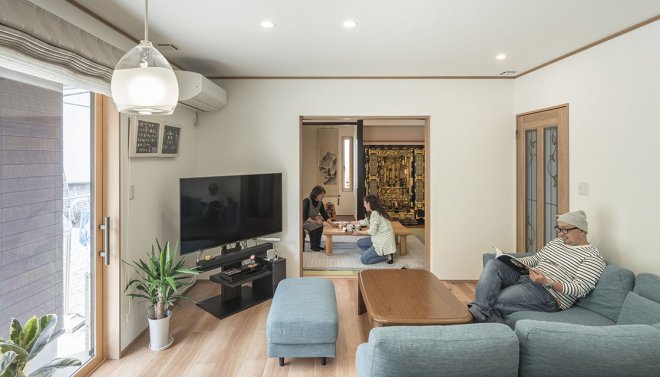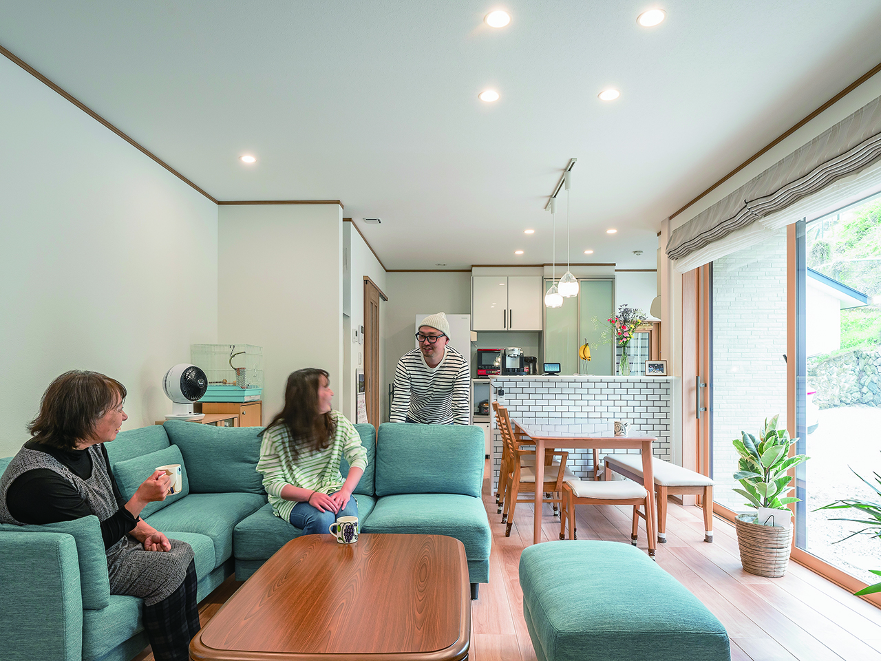 南面の窓から光が降り注ぐ1階リビングは、両世帯の団らんの場