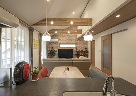 2階子世帯のリビングは「木目調と遊び心」がポイント。レンガ調のアクセントクロスを使い、天井には木の梁を見せた。
